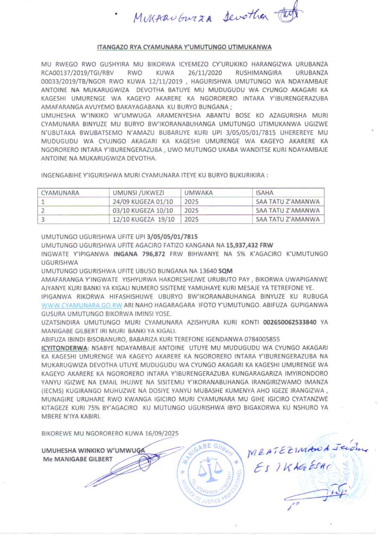 Yanditswe ku wa 16 Nzeri 2025 na AMAKURU MEDIA Post navigation Cyamunara y’inzu ibaruye kuri UPI: 1/01/01/05/17 iherereye Gitega / Nyarugenge Cyamunara y’umutungo utimukanwa ubaruye kuri UPI: 2/06/08/05/1221 iherereye Ntongwe / Ruhango