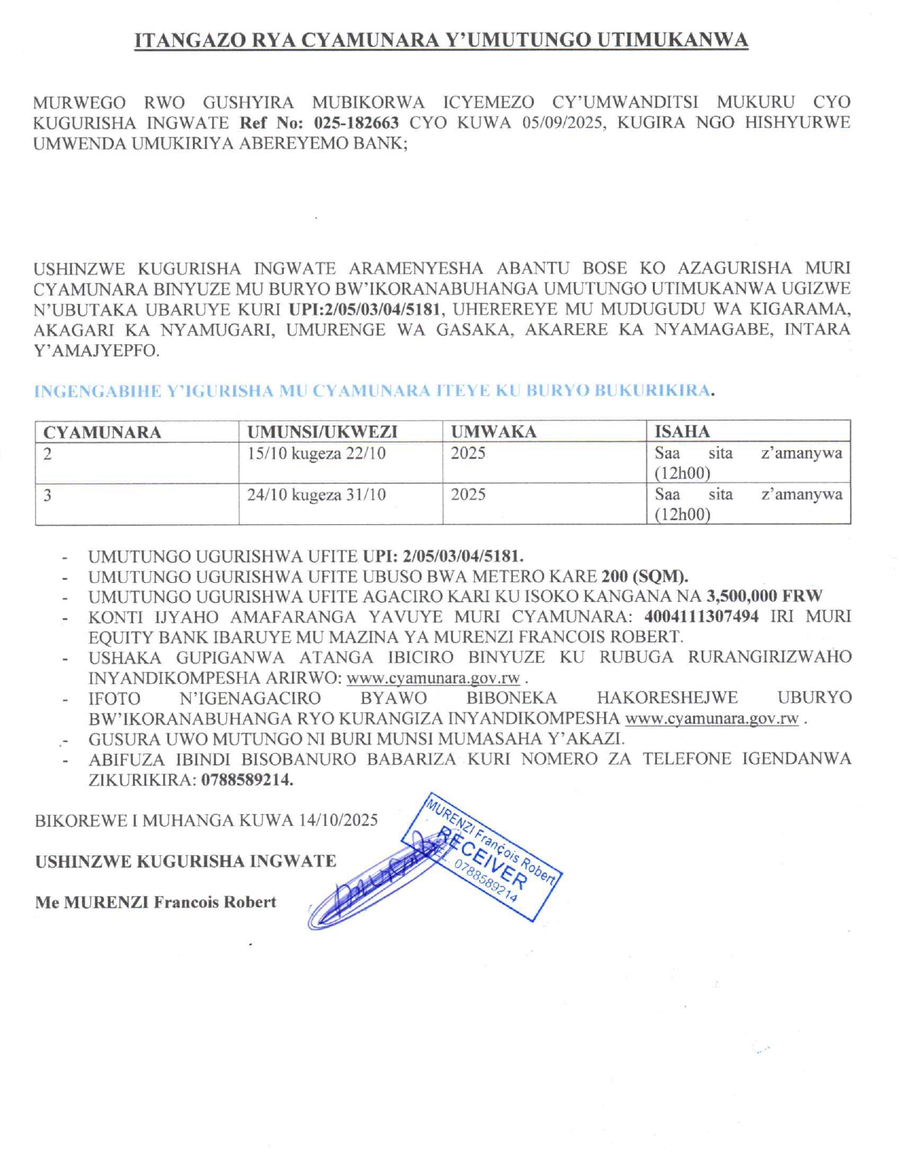 Post navigation Cyamunara y’ubutaka bwubatseho inzu bubaruye kuri UPI: 4/03/10/01/2544 buherereye Musanze