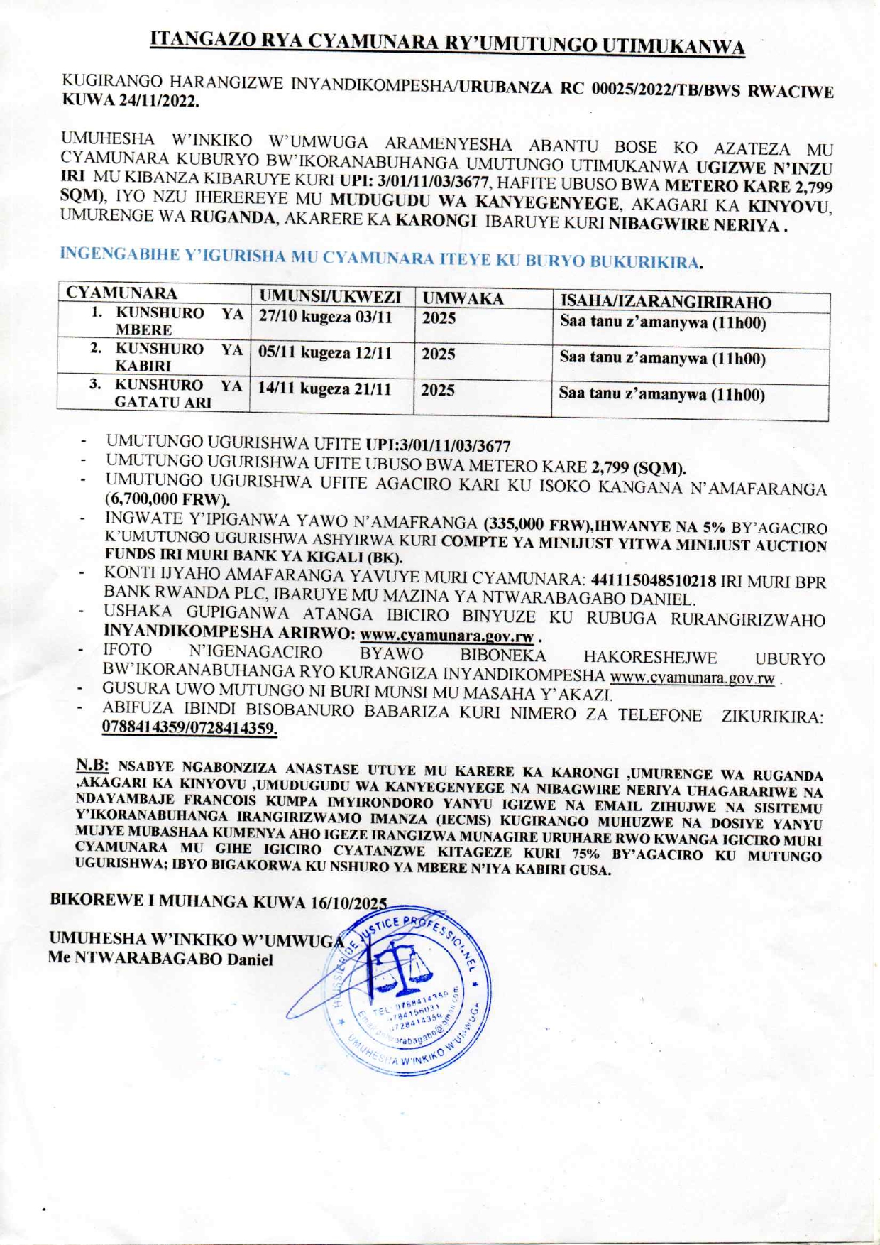 Yanditswe ku wa 24 Ukwakira 2025 na AMAKURU MEDIA Post navigation Cyamunara y’umurima urimo urutoki ubaruye kuri UPI: 2/06/02/03/902 uherereye Byimana / Ruhango