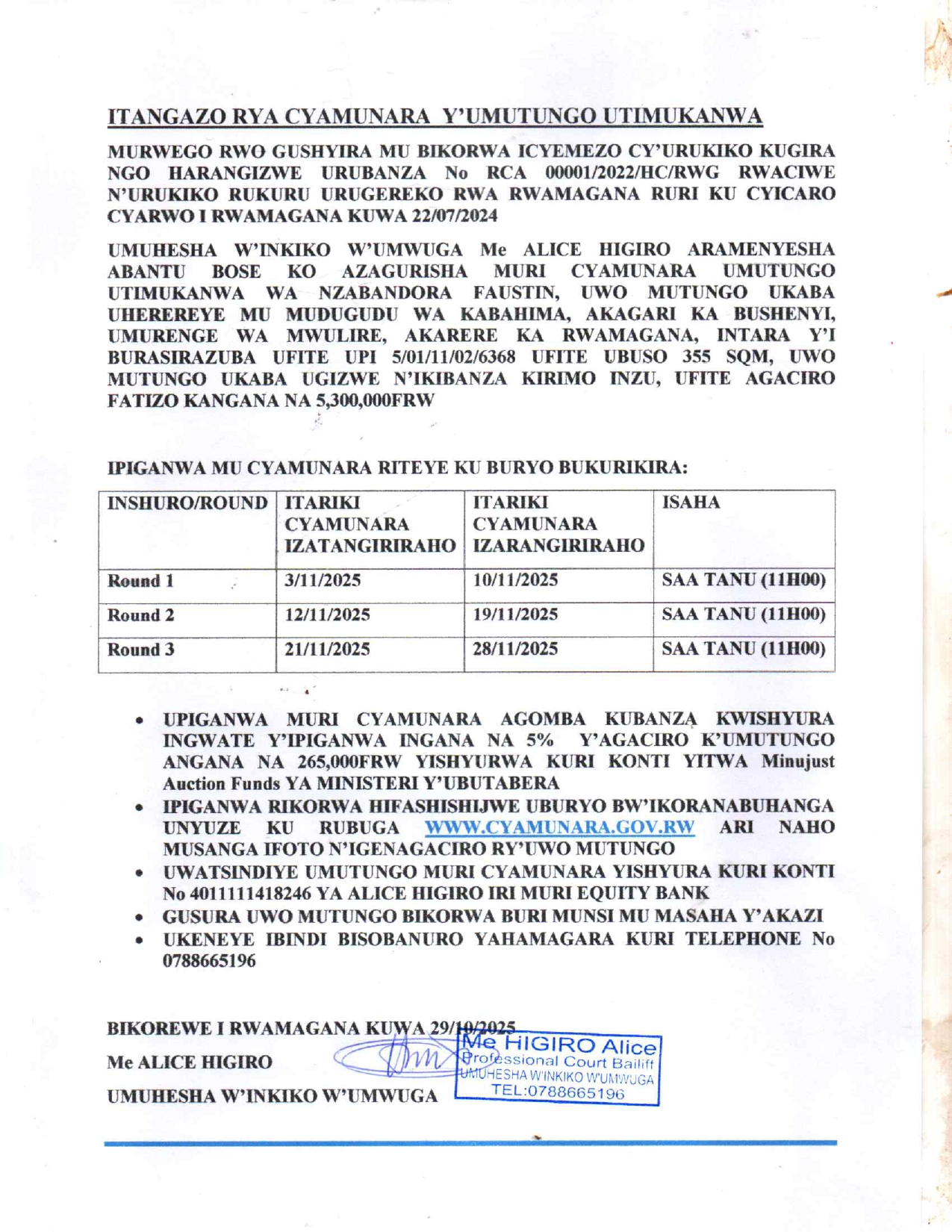 Post navigation Cyamunara y’ubutaka bwubatseho inzu bubaruye kuri UPI: 4/03/10/01/2544 buherereye i Musanze Cyamunara y’ubutaka bwubatseho inzu bubaruye kuri UPI: 1/01/03/05/535 buherereye mu Murenge wa Kigali/ i Nyarugenge