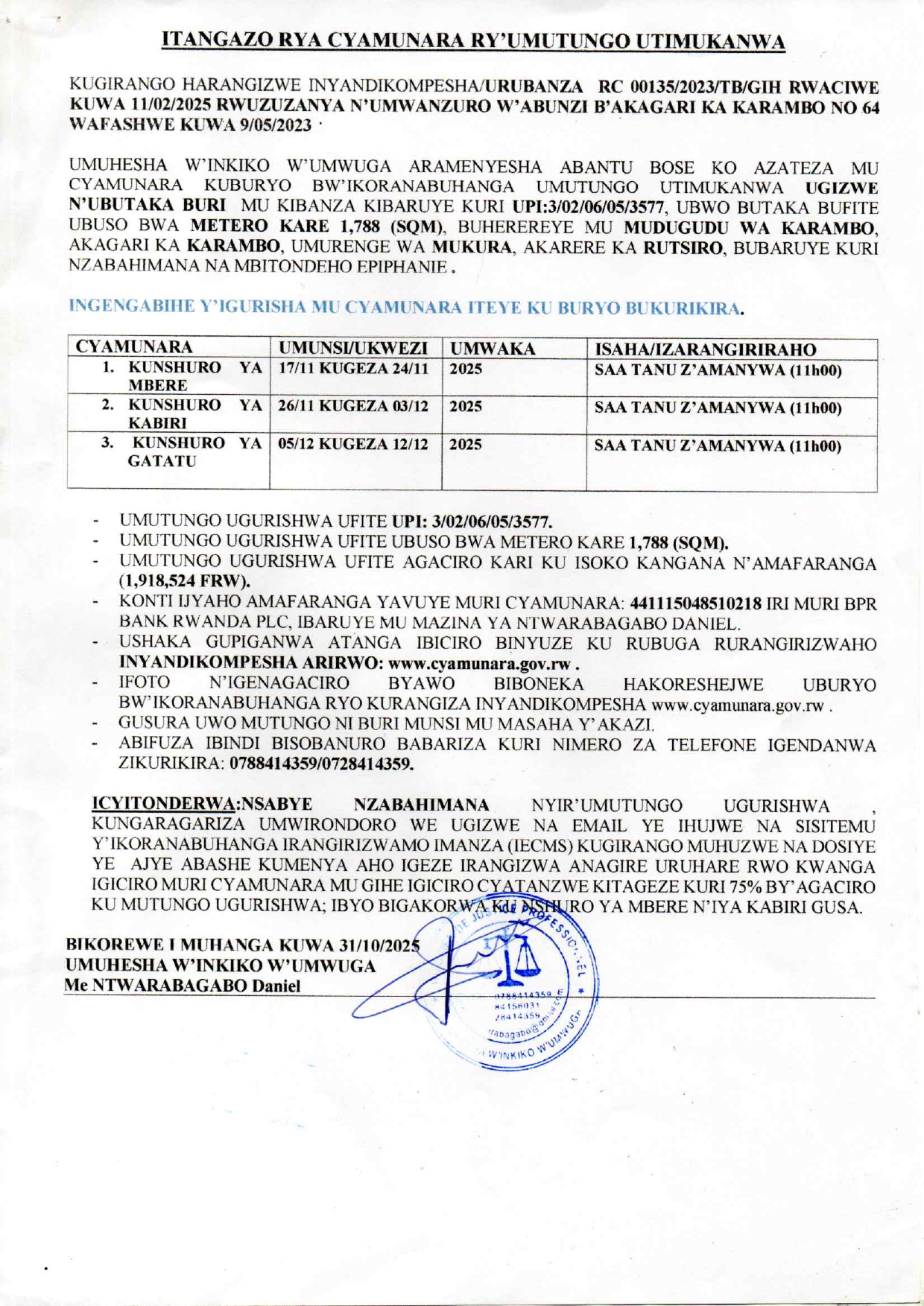 Post navigation Cyamunara y’umutungo utimukanwa ubaruye kuri UPI: 2/08/09/01/5284 uherereye Nyarubaka / Kamonyi Cyamunara y’inzu ibaruye kuri UPI: 3/01/01/01/6740 iherereye Bwishyura / Karongi