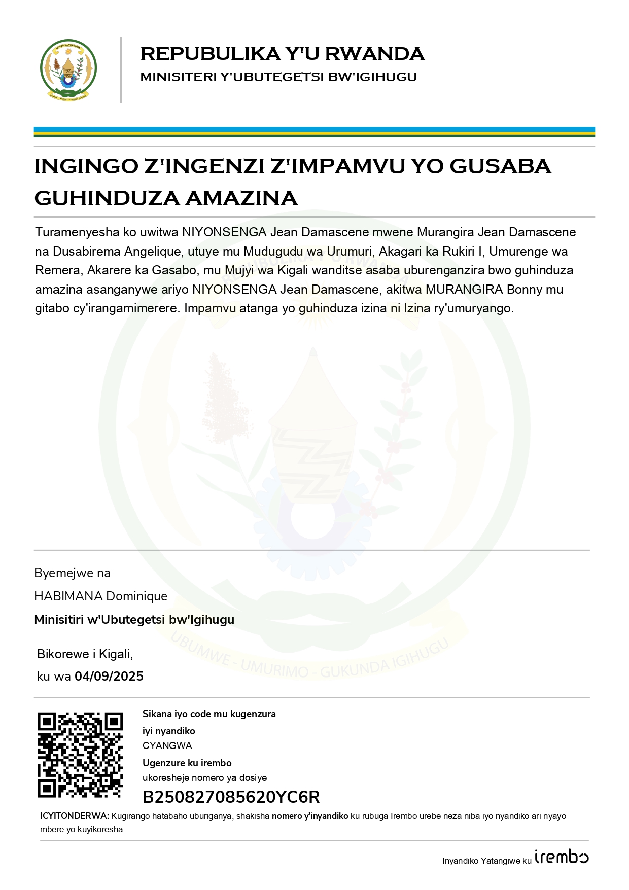 Yanditswe ku wa 27 Ugushyingo 2025 na AMAKURU MEDIA Post navigation Itangazo ryo guhindura amazina ya Uwamahoro Claudine akitwa Murekatete Jesca