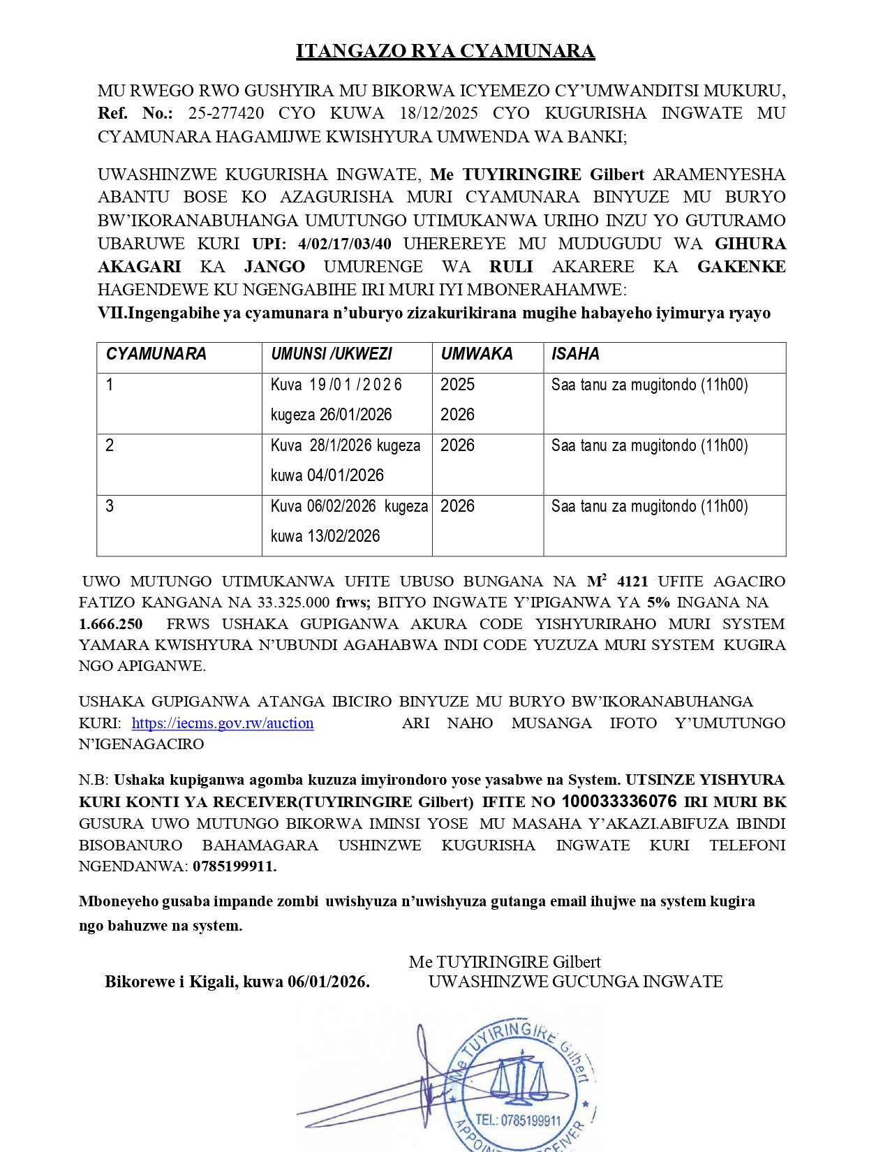 Post navigation Cyamunara y’ubutaka bwubatsemo inzu yo guturamo bubaruye kuri UPI: 1/02/07/02/1155 buherereye Kacyiru / Gasabo Cyamunara y’inzu yo guturamo ibaruye kuri UPI: 4/02/19/08/1438 iherereye Rushashi /Gakenke