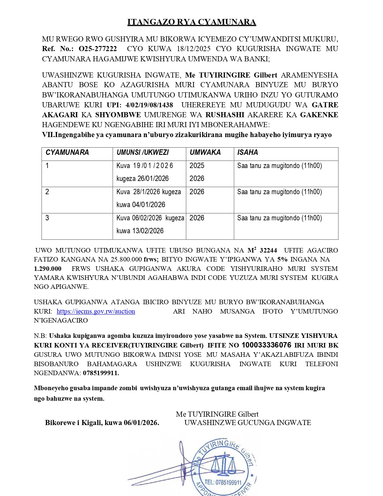 Post navigation Cyamunara y’inzu yo guturamo ibaruye kuri UPI: 4/02/17/03/40 iherereye i Ruli / Gakenke Cyamunara y’ikibanza kirimo inzu kibaruye kuri UPI: 5/04/04/03/1767 giherereye Mukarange / Kayonza