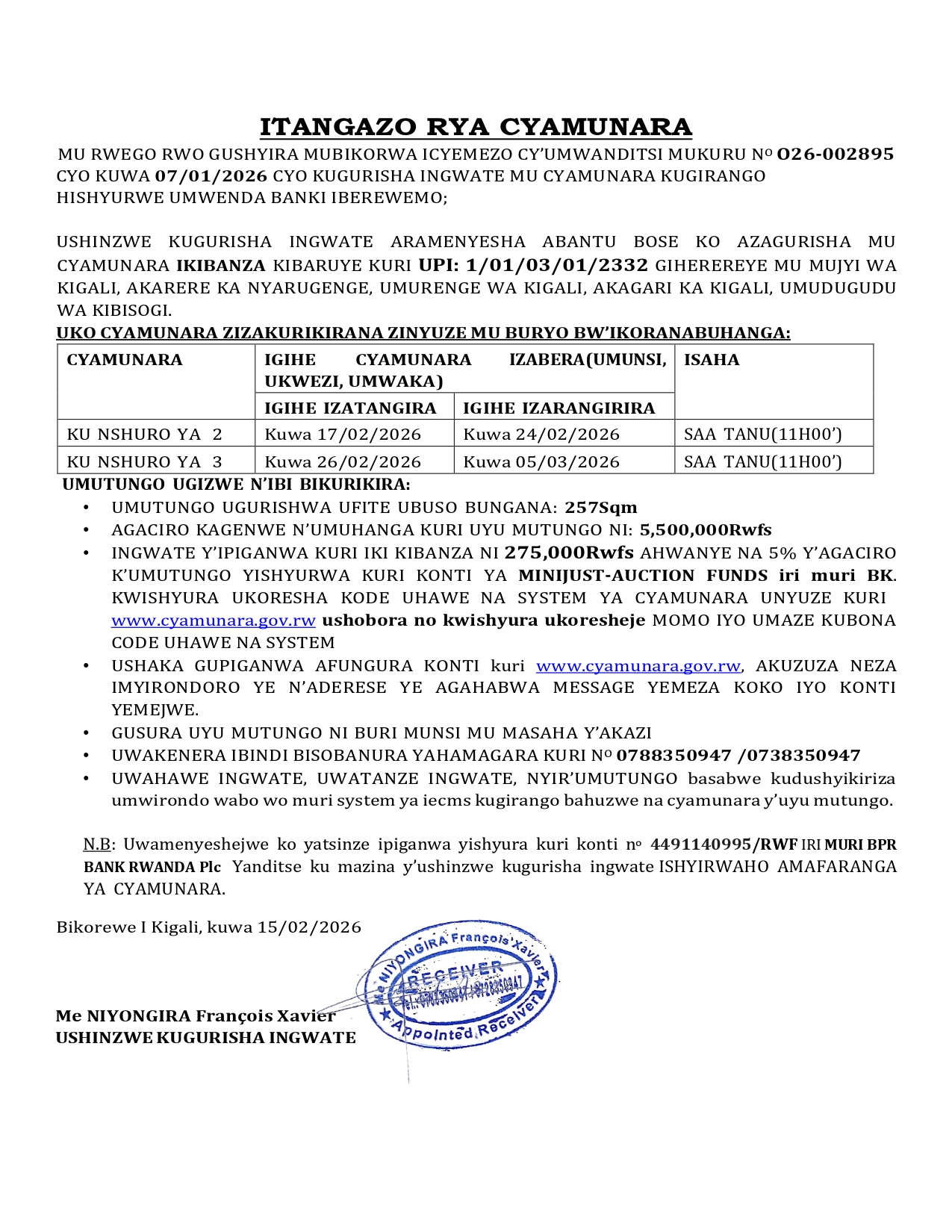 Yanditswe ku wa 16 Gashyantare 2026 na AMAKURU MEDIA Post navigation Cyamunara y’ubutaka buri mu kibanza UPI: 1/01/05/06/1941 buherereye Mageragere / Nyarugenge Cyamunara y’inzu ibaruye ku kibanza UPI: 2/01/01/02/2524 iherereye Busasamana / Nyanza