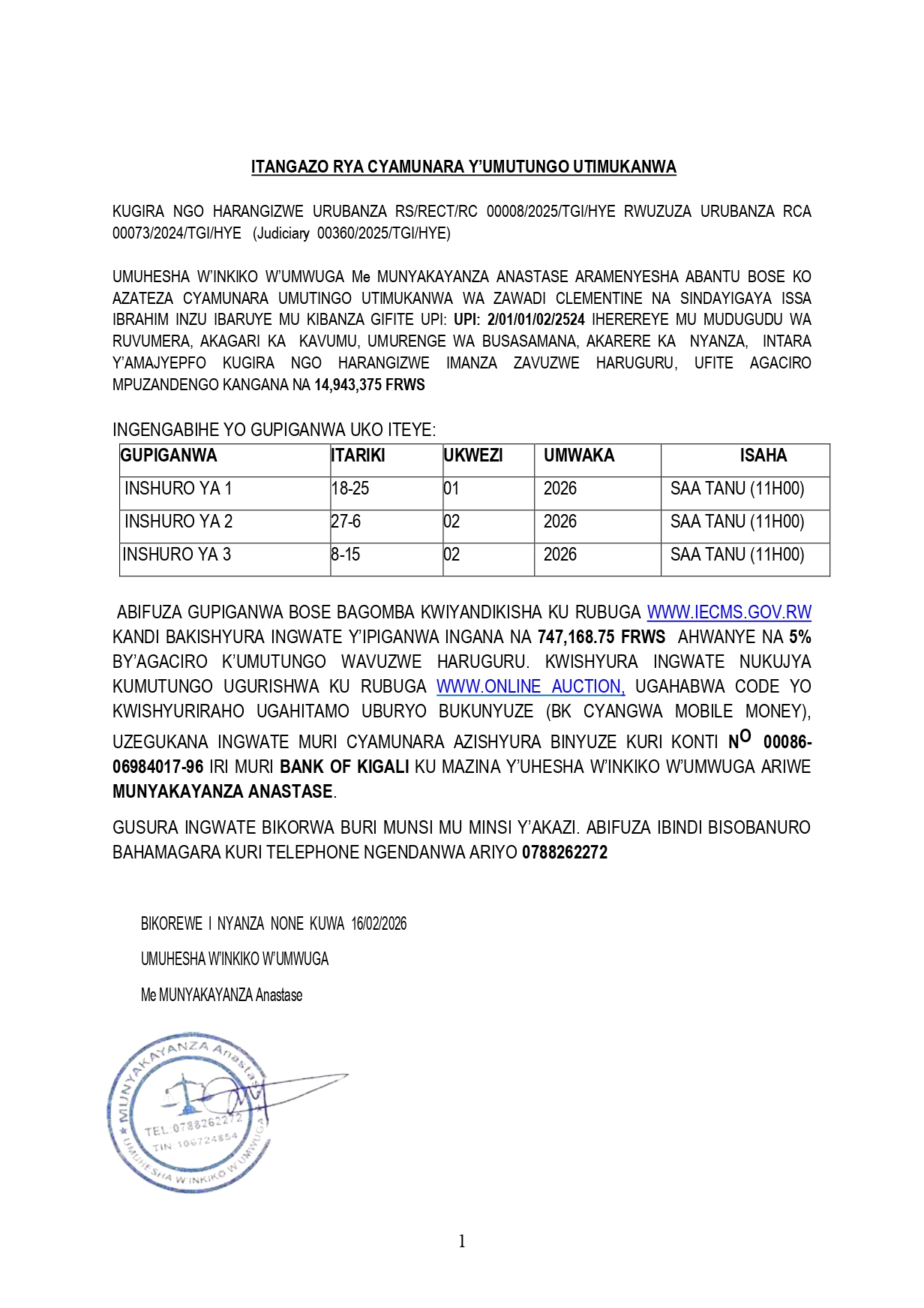Yanditswe ku wa 17 Gashyantare 2026 na AMAKURU MEDIA Post navigation Cyamunara y’ikibanza kibaruye kuri UPI: 1/01/03/01/2332 giherereye Kigali / Nyarugenge Cyamunara y’ubutaka buri mu kibanza UPI: 3/01/11/03/3531 buherereye Ruganda / Karongi