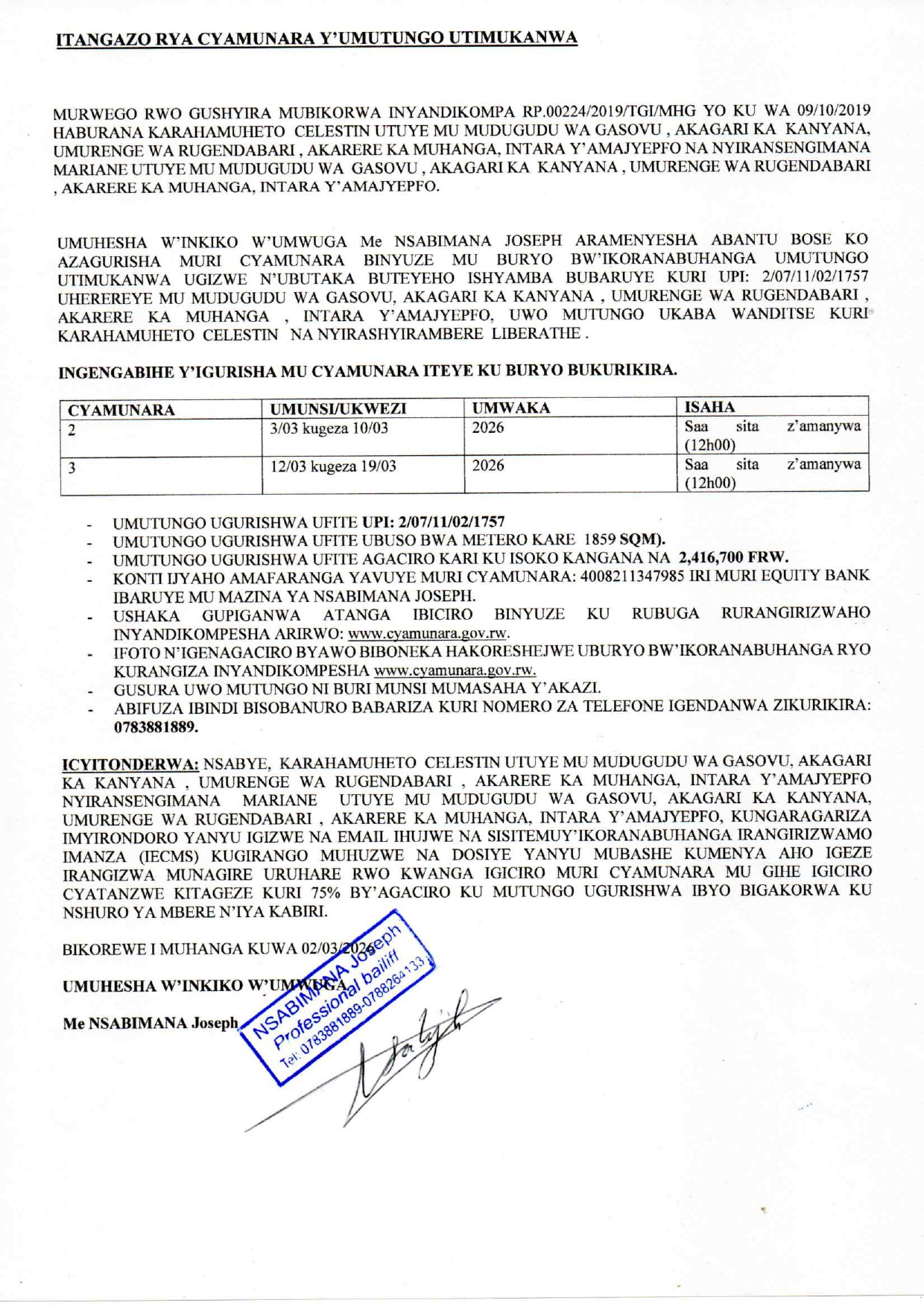 Post navigation Cyamunara y’ubutaka bubaruye kuri UPI: 5/07/10/02/1802 buherereye i Nyamata / Bugesera