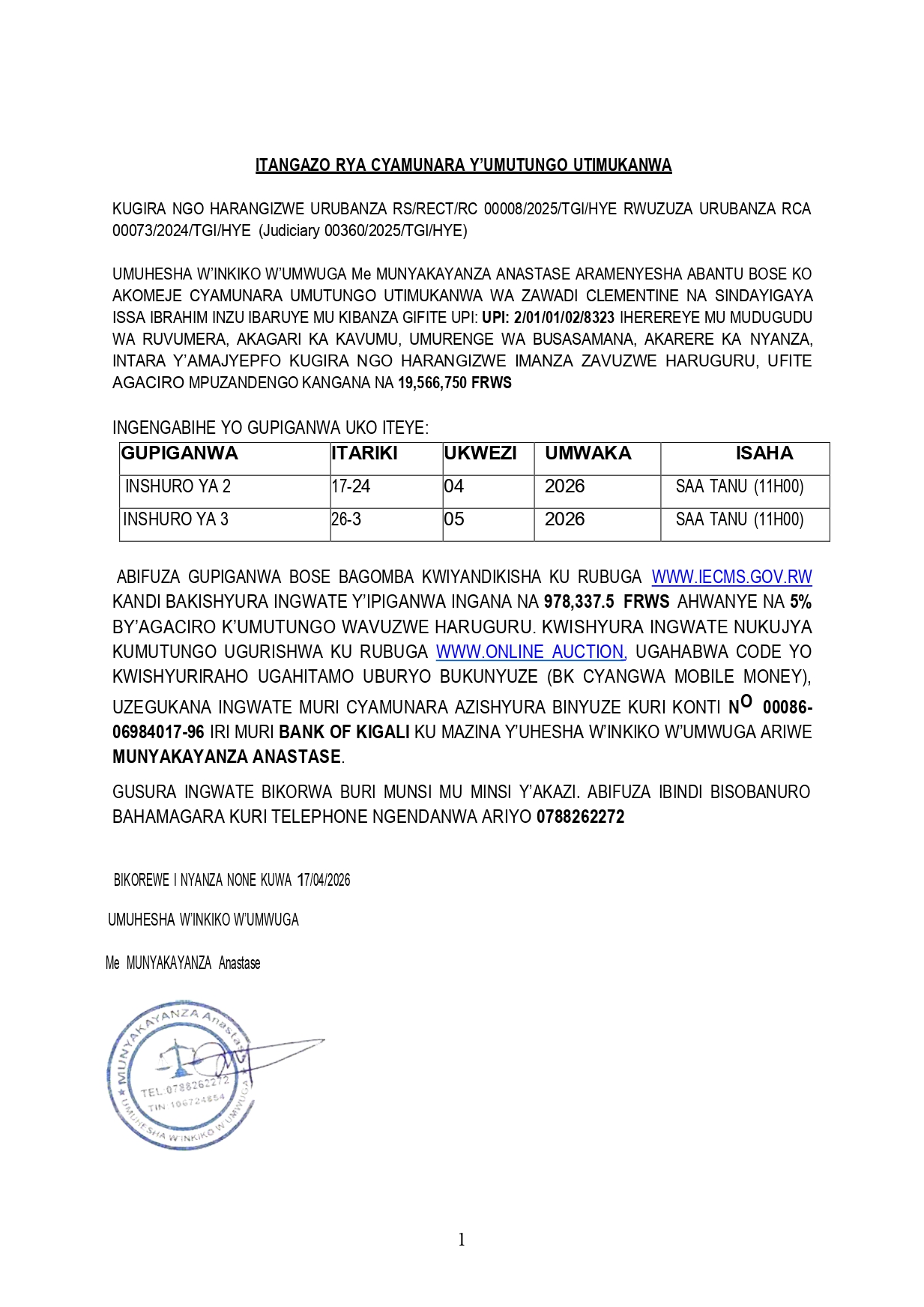 Yanditswe ku wa 17 Mata 2026 na AMAKURU MEDIA Post navigation Cyamunara y’ubutaka burimo inzu bubaruye kuri UPI: 1/02/09/01/3781 buherereye Kimironko / Gasabo Cyamunara y’ikibanza kibaruye kuri UPI: 2/08/08/02/495 giherereye Nyamiyaga / Kamonyi