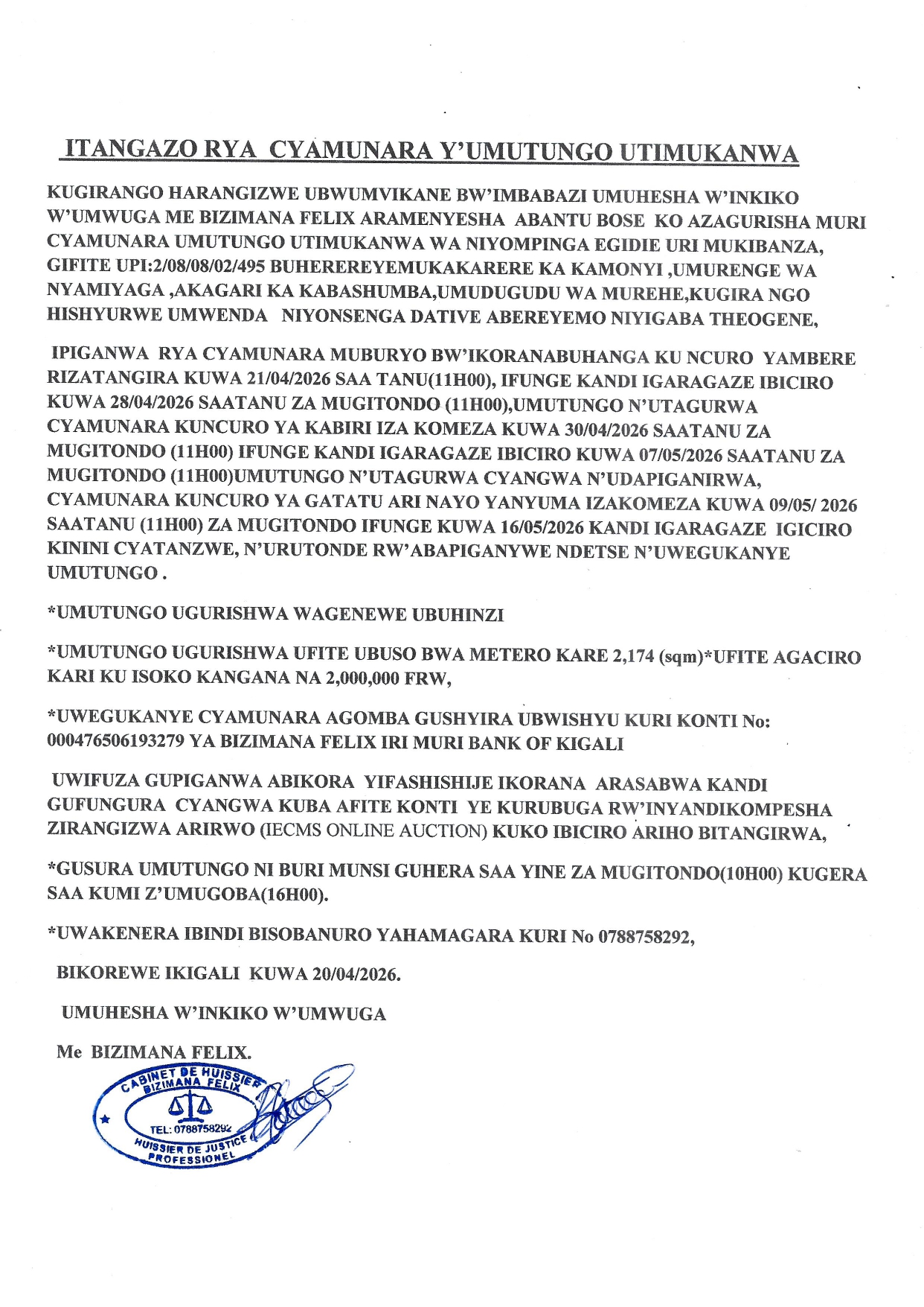 Post navigation Gutangaza cyamunara y’umutungo utimukanwa ubaruye kuri UPI: 2/01/01/02/8323 uherereye Busasamana / Nyanza